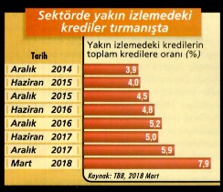 Türkiye Bankalar Birliğimin (TBB) verilerine göre, 2014 sonunda yüzde 3,9 olan yakın izlemedeki kredilerin toplam kredilere oranı, bu yılın ilk çeyreğinde yüzde 7,9'a çıktı. Daha yakın tarihe bakılırsa bu kalem, Haziran 2017 de yüzde 5'ti. Yani sadece 9 ayda yüzde 2,9'luk ciddi bir artış görülüyor.