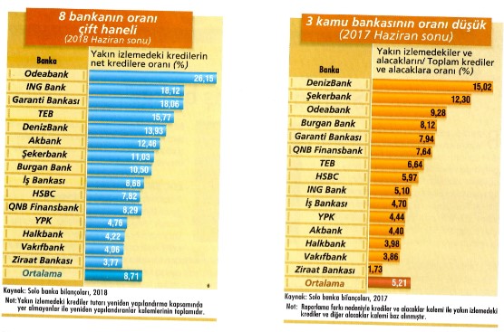 Bu yıl geçilen UFRS9 standartları dünyada da yeni ve bankadan bankaya yorum farklılıkları yaşanıyor. Çünkü her bankanın risk değerlendirmesi farklı. Örneğin Moody’s’in raporunda bu yılın ilk çeyreğinde Garanti Bankası’nın yakın izlemedeki alacaklarının toplam kredilere oranı yüzde 16,1’di. Basına konuşan Garanti Bankası Yatırımcı İlişkileri Bölüm Başkanı Handan Saygın, bu oranların ortakları BBVA tarafından tanımlanan UFRS 9 muhasebe kurallarına göre muhafazakar yaklaşımı yansıttığını belirtmişti. Banka bazında 2018’in ilk yarısında özel yabancı sermayeli bankaların daha yüksek oranlar taşıdığı da görülüyor.