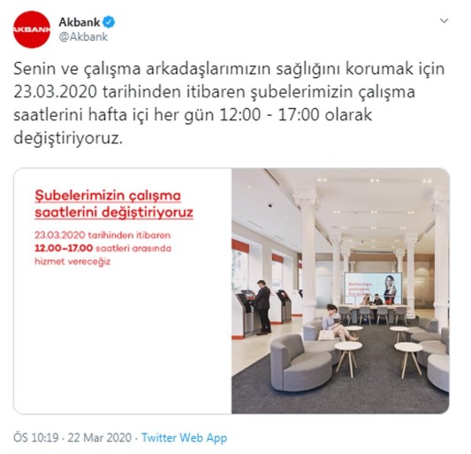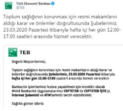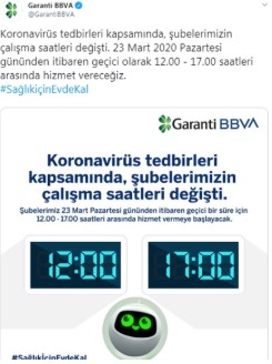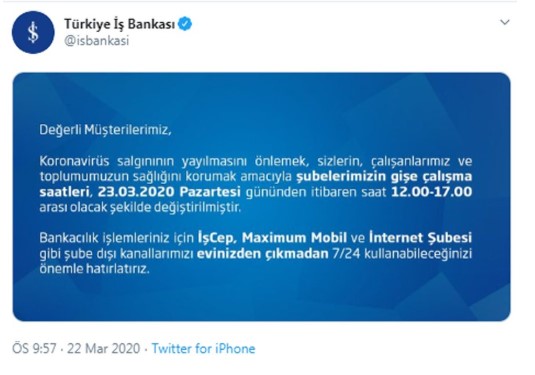Türkiye İş Bankası tarafından yapılan açıklamada “Korona virüs salgınının yayılmasını önlemek, sizlerin, çalışanlarımızı ve toplumumuzun sağlığını korumak amacıyla şubelerimizin gişe çalışma saatleri, 23.03.2020 Pazartesi gününden itibaren saat 12.00-17.00 arası olacak şekilde değiştirilmiştir” denildi.
