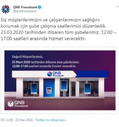 QNB Finansbank, 23 Mart 2020 tarihinden itibaren tüm şubelerinin 12.00-17.00 arasında hizmet vereceğini duyurdu.