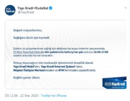 Yapı Kredi Bankası tarafından çalışma saatlerine dair yapılan açıklamada “Sizlerin ve çalışanlarımızın sağlığı için aldığımız koruyucu önlemler çerçevesinde, 23 Mart Pazartesi itibarıyla tüm şubelerimiz hafta için her gün yalnızca 12.00-17.00 saatleri arasında hizmet verecektir” ifadeleri kullanıldı.