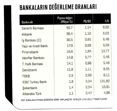 Banka hisselerinin ortalama halka açıklık oranı yüzde 33. BIST Banka Endeksi'ne dahil 12 bankanın toplam piyasa değeri 189 milyar TL. Bu kurumların halka açık piyasa değeri ise 63 milyar TL. İçlerinde piyasa değeri en yüksek olan Garanti Bankası'nın piyasa değeri 40 milyar 656 milyon TL. Kurumun atılımlarına baktığımızda, mobil pazarlamada hızla ilerlediğini görüyoruz. Mobil pazarlamanın gelişimine yön veren MMA’in (Mobile Marketing Association / Mobil Pazarlama Birliği) Türkiye oluşumunun yönetim kurulu başkanı ve Garanti Bankası Direkt Bankacılık Yöneticisi Işık İlhan, bankanın 2,7 milyon müşterisinin sadece mobil bankacılığı kullandığını beliriyor. İlhan, bankaların mobil dönüşüm ve mobil teknolojilere büyük önem verdiğini belirtirken, "Garanti Bankası olarak aktif dijital müşteri sayımız 5,1 milyonken bu kullanıcıların 4,1 milyonu mobilde aktif olarak görünüyor" diyor. Borsada işlem gören bankalar içerisinde piyasa değeri en yüksek ikinci banka 36 milyar 360 milyon TL ile Akbank olurken onu 30 milyar 464 milyon TL ile İş Bankası izliyor. Şeker Yatırım, 14 Nisan'da Garanti Bankası hedef fiyatını 9,59 TL'den 11,35 TL'ye yükseltti; tavsiyesi ise "al" yönünde.