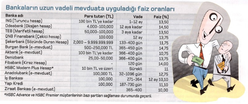 Bugün çoğu bankanın bir ay ile 12 ay vadeli mevduat faiz oranları neredeyse eşitlenmiş durumda. Örneğin, vade bozmadan para yatırıp çekme imkanı sağlayan ING Bank'ın Turuncu Hesap'ı, Odeabank'ın Oksijen Hesap'ı bir gün ile 12 ay arasındaki tüm vadelere aynı faizi uyguluyor. ING Bank Turuncu Hesap müşterilerine yüzde 13.50, Odeabank Oksijen Hesap'a ise 14.50 faiz veriyor.