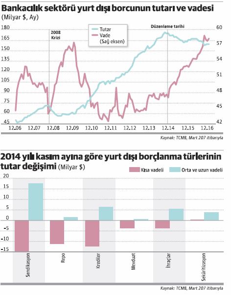 Merkez Bankası’nın bankaların uzun vadeli borçlanmasını teşvik etmeye başlamasının ardından finans kesiminn ortalama dış borç vadesi 47 aydan 58 aya uzadı. TCMB’nin ilk adımlarını Kasım 2014’te attığı tedbirlerin sonrasında kısa vadeli borçların toplam borçlar içindeki payı ise yüzde 52’den yüzde 24’e düştü.