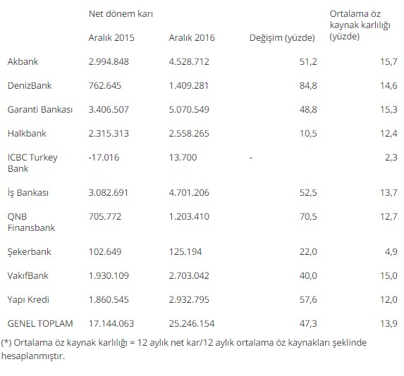 Akbank ise ortalama öz kaynak karlılığı en yüksek banka oldu. Aralık 2016 itibarıyla ortalama öz kaynak karlılığı yüzde 15,7 düzeyinde bulunan Akbankı, yüzde 15,3 ile Garanti Bankası, yüzde 15 ile VakıfBank, yüzde 14,6 ile DenizBank, yüzde 13,7 ile İş Bankası, yüzde 12,7 ile QNB Finansbank ve yüzde 12,4 ile Halkbank izledi.