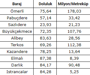 İstanbul Su ve Kanalizasyon İdaresinin (İSKİ) verilerinden derlenen bilgilere göre, kente su sağlayan barajlardaki doluluk oranı, son 10 yılın en yüksek 3. seviyesine ulaştı.
