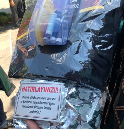AK Parti ve MHP milletvekillerinin imzasını taşıyan bir ilde birden fazla baro kurulmasının önünü açan 28 maddelik yasa teklifinin Adalet Komisyonu görüşmeleri devam ederken Meclis önünde bekleyen baro başkanları komisyonun hukukçu milletvekillerine cübbe, düğme ve dikiş seti gönderdi.