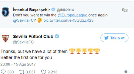 İspanyol ekibi Başakşehir'in tweet'ine "Teşekkürler, ancak bizde ondan çok var. Siz ilk kez kazansanız daha iyi" diye yanıt verdi.