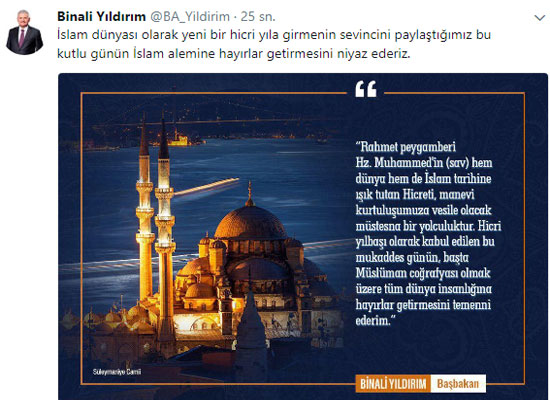 Yıldırım, mesajında, Sultan Ahmet Camisi'nin görseli eşliğinde, "Rahmet peygamberi Hazreti Muhammed'in hem dünya hem de İslam tarihine ışık tutan hicreti, manevi kurtuluşumuza vesile olacak müstesna bir yolculuktur. Hicri yılbaşı olarak kabul edilen bu mukaddes günün, başta Müslüman coğrafyası olmak üzere insanlığa hayırlar getirmesini temenni ederim" ifadesine yer verdi.