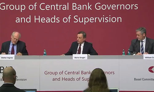 Merkez Bankası Yöneticileri ve Denetim Başkanları Grubu (GHOS) Başkanı da olan Draghi, Basel Bankacılık Denetleme ve Düzenleme Komitesi Başkanı Stefan Ingves ve Basel Komitesi Sekreteri William Coen, Basel III reformlarının onaylanmasına ilişkin ECB Genel Merkezi'nde ortak basın toplantısı düzenledi.