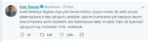 Telefonunun susmadığını ifade eden Cem Davran, Twitter hesabından, "Araklı Belediye Başkanı diye yine benim telefon çalıyor sürekli. Bu sefer arayan ablamıza bunun hep olduğunu anlattım. 'Sanırım numaramız çok benziyor' dedim, ikna olmayınca adımı söyledim. 'Sen tiyatrocusun değil mi?' dedi. Oğlu da tiyatroyla uğraşıyormuş, muhabbet ettik, vedalaştık" paylaşımında bulundu. Davran'ın ilgi gören paylaşımı takipçilerini gülümsetti.