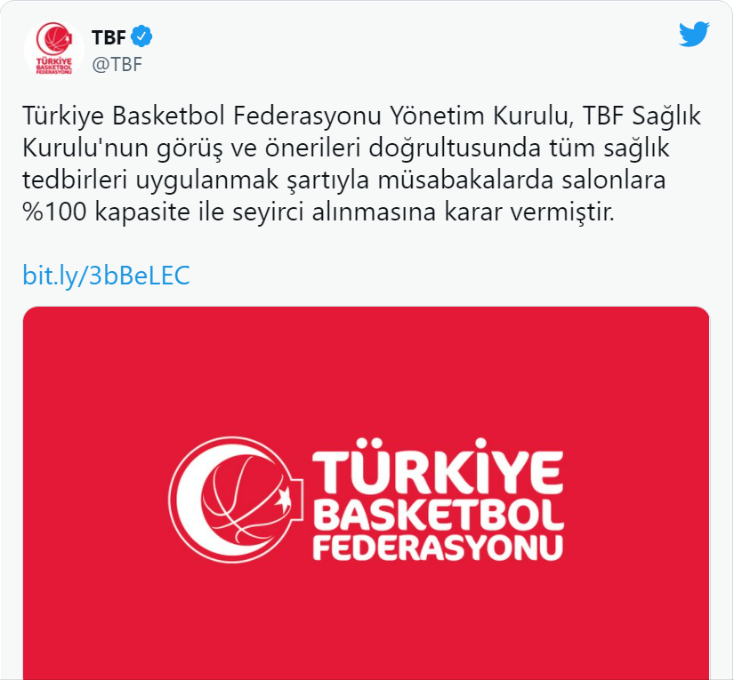 TBF'den yapılan açıklamada, "Türkiye Basketbol Federasyonu Yönetim Kurulu, TBF Sağlık Kurulunun görüş ve önerileri doğrultusunda tüm sağlık tedbirleri uygulanmak şartıyla müsabakalarda salonlara yüzde 100 kapasite ile seyirci alınmasına karar vermiştir" denildi.