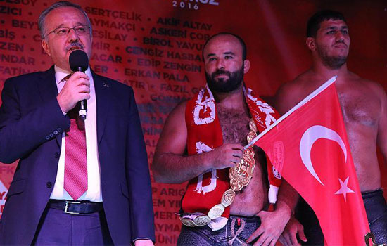657. Tarihi Kırkpınar Yağlı Güreşleri Başpehlivanı Orhan Okulu da şehit ailelerine baş sağlığı, şehitlere de Allah'tan rahmet dilediğini belirterek, "Bu kemeri de şehitlerimize armağan ediyorum. Hepinize teşekkür ediyorum." ifadelerini kullandı.