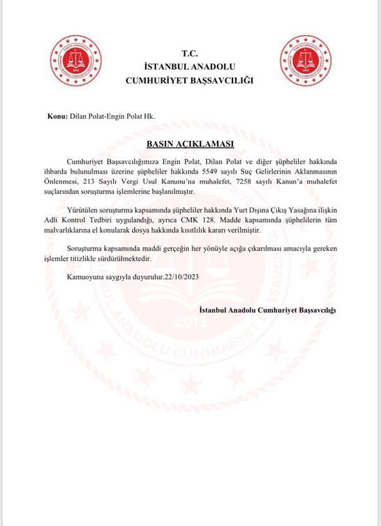 Başsavcılık tarafından yapılan basın açıklamasında, "Cumhuriyet Başsavcılığımıza Engin Polat, Dilan Polat ve diğer şüpheliler hakkında ihbarda bulunulması üzerine şüpheliler hakkında 5549 sayılı Suç Gelirlerinin Aklanmasının Önlenmesi, 213 Sayılı Vergi Usul Kanunu’na muhalefet, 7258 sayılı Kanun’a muhalefet suçlarından soruşturma işlemlerine başlanılmıştır.