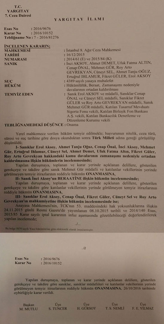 İstanbul 8. Ağır Ceza Mahkemesi’nde görülen davada mahkeme geçen Aralık ayında Erol Aksoy'a 8 yıl 4 ay, 5 bin 500 TL de adli para cezası vermişti. Mahkeme, sanıklardan Cenap Önal, Fikret Güler, Roy Arto Gevrekyan’ın banka yönetim kurulu üyesi, Cüneyt Sel’in yönetim kurulu başkanı olduğuna dikkat çekerek bu kişilere de 7’şer yıl 2’şer ay 20’şer gün hapis ve 3 bin 520’şer TL adli para cezası vermişti.