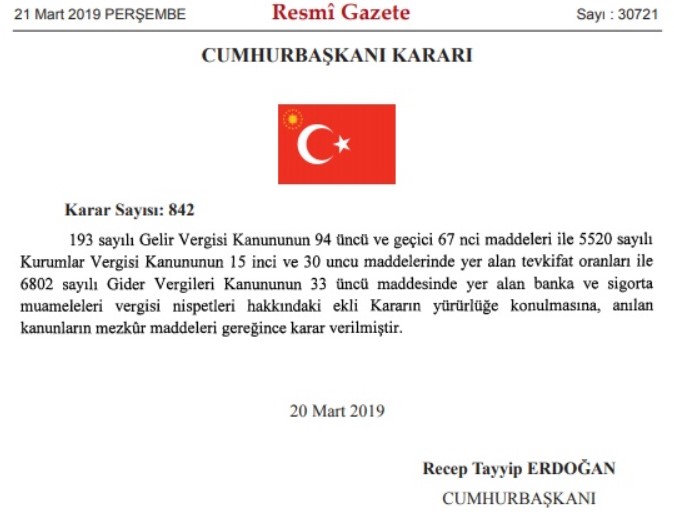 Vadesiz ve ihbarlı hesaplar ile 1 yıla kadar (1 yıl dahil) vadeli hesaplarda yüzde 20 olarak belirlendi.