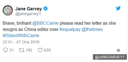 Twitter'da konu ile ilgili aralarında BBC gazetecilerinin de olduğu çok sayıda paylaşım yapıldı. "Carrie ile omuz omuza" (#IStandWithCarrie) etiketi ile destek mesajları verildi.