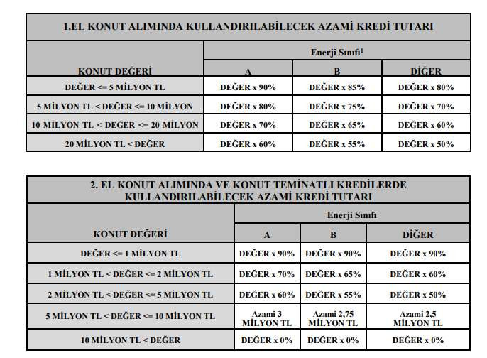 Değeri 5 milyon lira ile 10 milyon lira arasındaki ikinci el konutlarda 2,5 milyon lira ila 3 milyon lira tutarında kredi kullanılabilirken, 10 milyon lira üzerindeki ikinci el konutlar için kredi kullanılamayacak.