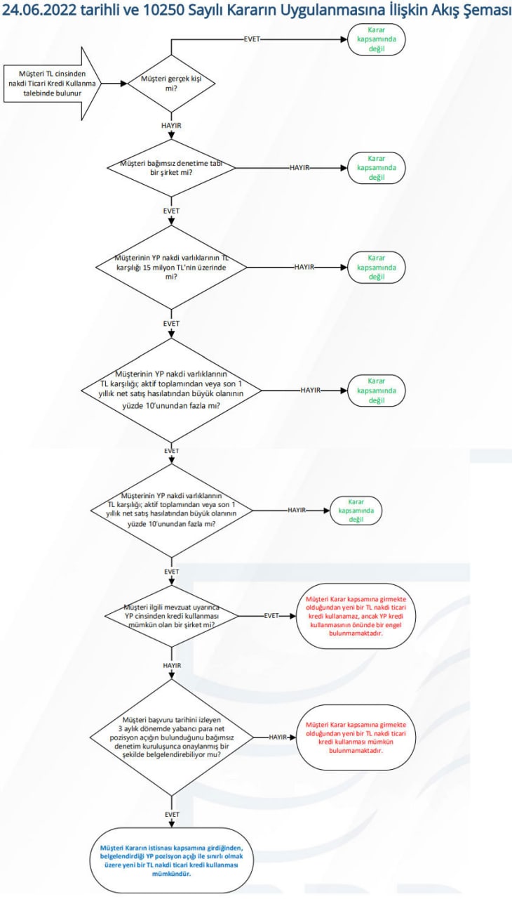 *Karar tarihinden önce kredi başvurusu yapılarak sözleşmesi akdedilmiş ancak henüz kullandırımı yapılmamış ve yalnızca 27 Haziran 2022 tarihiyle başlayan hafta içinde kullandırımı yapılacak olan spot nitelikli TL cinsinden nakdi ticari krediler için ise herhangi bir ilave kontrol yapılmasına gerek bulunmamakta olup, ilgili krediler Karar'dan etkilenmeyecektir.
