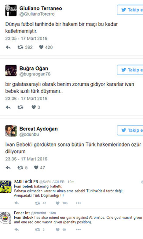 UEFA Avrupa Ligi'nde Braga-Fenerbahçe karşılaşmasının hakemi İvan Bebek, sarı-lacivertli takımı adeta doğradı. Hırvat hakem, İvan Bebek, Twitter'da TT olurken binlerce kişiden tepki çekti. Bebek'in maçın başından itibaren tüm takdir haklarını Braga'dan yana kullanması spor severleri çileden çıkardı. Braga'nın attığı ilk goldeki bariz ofsaytı göstermemesi, Mehmet Topal'a ilk sarı kart ve Pereira'nın tribüne gönderilmesi taraftarları öfkelendirdi. Ancak 66. dakikada Bebek'in skandal penaltı kararı ve Mehmet Topal'a ikinci sarı karttan kırmızı kartı göstermesi bardağı taşıran son damla oldu.