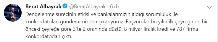 "Dengelenme sürecinin etkisi ve bankalarımızın aldığı sorumluluk ile konkordatoları gündemimizden çıkarıyoruz. Başvurular bu yılın ilk çeyreğinde bir önceki çeyreğe göre 3’te 2 oranında düştü. 8 milyar liralık kredi ve 787 firma konkordatodan çıktı."