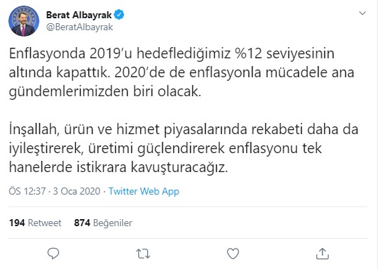 Albayrak, Twitter hesabından yaptığı açıklamada, 2019 yılı enflasyon ve ihracat rakamlarını değerlendirdi.