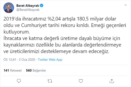 Geçen yıl ihracatın yüzde 2,04 artışla 180,5 milyar dolar olarak gerçekleştiğine ve Cumhuriyet tarihi rekoru kırıldığına işaret eden Berat Albayrak, bu başarıda emeği geçenleri kutlayarak şunları kaydetti: