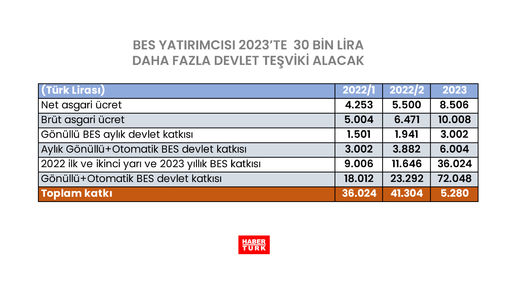 Habertürk’ten Rahim Ak’ın haberine göre; yüzde 54.6'lık artış ile 2023'te sadece gönüllü BES'te bulunun vatandaşlar 120 bin 96 liralık birikime karşı (aylık 10 bin 8 lira) 1 yılda 36 bin 24 liralık (aylık 3 bin 2 lira) devlet teşviki alacak. Hem gönüllü BES hem otomatik BES'te bulunan vatandaşlar ise bu tutarın iki katı yani 72 bin 48 lira (aylık 6 bin 4 lira) teşvik alacak. Tabii toplam 240 bin 192 liralık tasarrufa karşı bu teşvik hak edilecek.