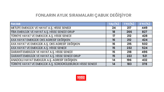 BES fonlarını incelediğimizde ise aylık getiride yüzde 24 ile Metlife Emeklilik hisse fonu ilk sırada yer alıyor. Bu fonun 1 yıllık getirisi yüzde 217 ve 3 yıllık getirisi ise yüzde 449 oldu. İkinci sırada Fiba Emeklilik hisse fonu bulunuyor. Bu fonun aylık getirisi yüzde 18 yıllık getirisi yüzde 266 ve 3 yıllık getirisi ise yüzde 827 gibi astronomik düzeyde. Üçüncü sırada ise aylık yüzde 17'lik getiri ile Türkiye Hayat hisse fonu bulunuyor. Bu fonun uzun vadeli getirisi de diğerlerinden kötü değil.