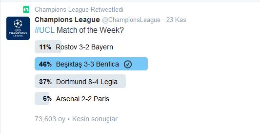 Şampiyonlar Ligi'nin Twitter hesabı bir anket düzenleyerek haftanın en güzel maçının hangisi olduğunu kullanıcılara sordu. Şampiyonlar Ligi ankete Rostov-Bayern Münih, Beşiktaş-Benfica, Borussia Dortmund-Legia Varşova ve Arsenal-Paris Saint Germain mücadelelerini ekledi. Toplam 73 bin 603 oyun kullanıldığı ankette Beşiktaş-Benfica maçı yüzde 46 oy aldı ve haftanın maçı seçildi.