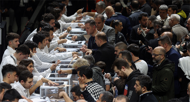 Genel kurul üyeleri Hasan Arat için turuncu, Serdal Adalı için de beyaz renkte basılan oy pusulalarını kullanıyor.