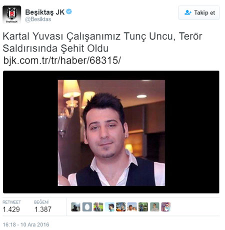 Siyah beyazlıların, ilk açıklamarında "Vodafone Arena yakınında yaşanan bombalı terör saldırısında, 29 yaşındaki Kartal Yuvası mağazası çalışanlarımızdan Tunç Uncu'nun şehit olması kulübümüzü derinden üzdü. Hain saldırıda kaybettiğimiz tüm şehitlerimize ve Uncu'ya Allah'tan rahmet, ailelerine, yakınlarına, sevenlerine ve camiamıza başsağlığı, yaralılarımıza da acil şifalar dileriz" denildi.