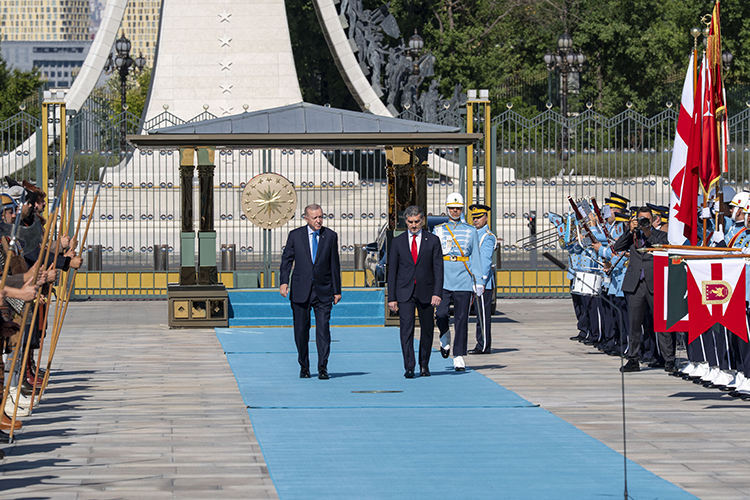 Cumhurbaşkanı Erdoğan, Kavelashvili'yi külliyenin ana giriş kapısında karşıladı. Erdoğan ve Kavelashvili'nin tören alanındaki yerlerini almasının ardından, bando iki ülke milli marşlarını çaldı.