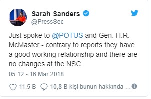 Washington Post'un Trump'ın bir yıldan daha uzun bir süredir Ulusal Güvenlik Bakanı olarak görev yapan McMaster'ı kovmayı planladığı yönündeki haberinin ardından Sanders, twitter hesabından yaptığı açıklamada, "Başkan Trump ve General H. R. McMaster ile şimdi görüştüm. Çıkan haberlerin aksine, Ulusal Güvenlik Konseyi'nde herhangi bir değişiklik olmayacak" ifadesini kullandı.