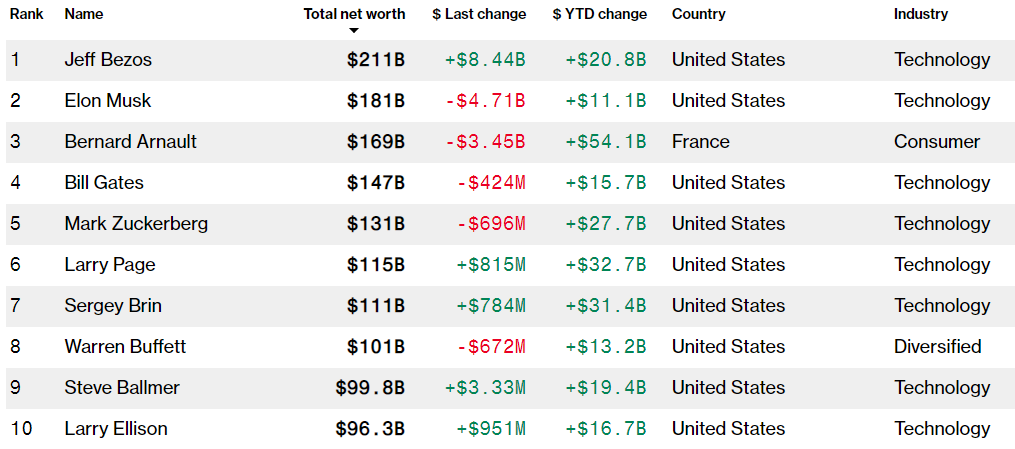 Dünyanın en zenginleri sıralamasında Bezos’un hemen ardından Tesla CEO’su Elon Musk ve lüks tüketim ürünleri satan Bernard Arnault geliyor.