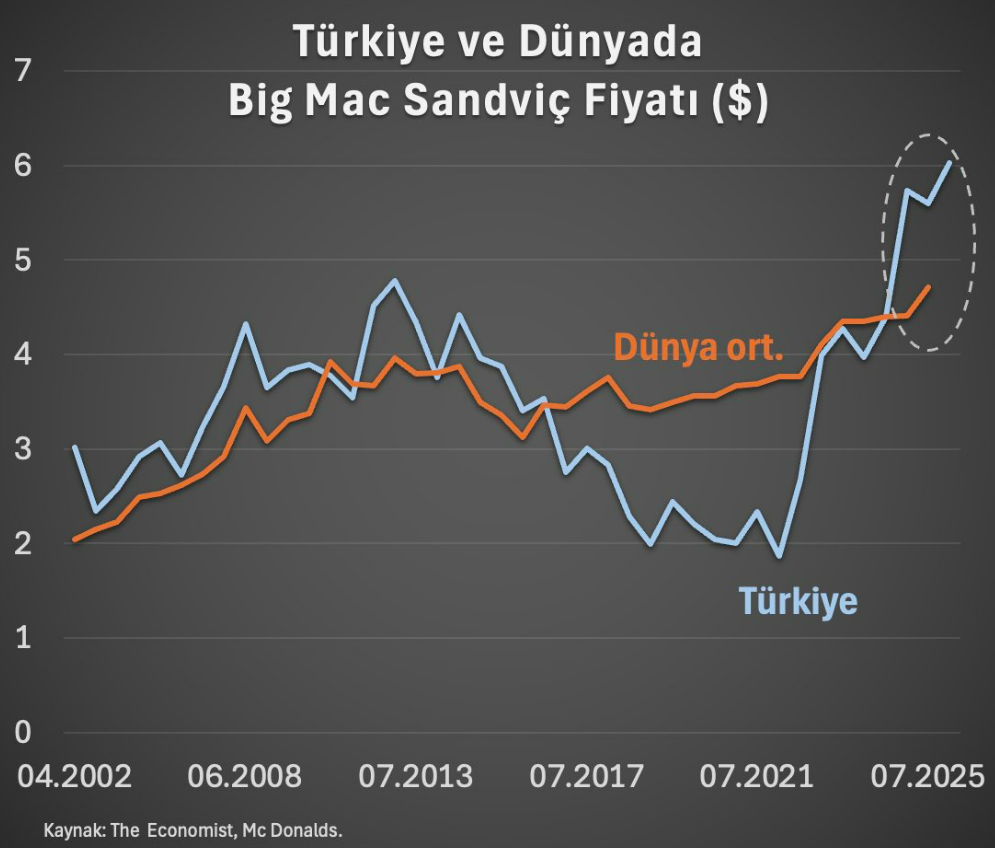 The Economist ve McDonald’s verilerine dayanan grafikte, Türkiye’de Big Mac fiyatlarının son yıllarda belirgin ve hızlı bir artış gösterdiği görülüyor.