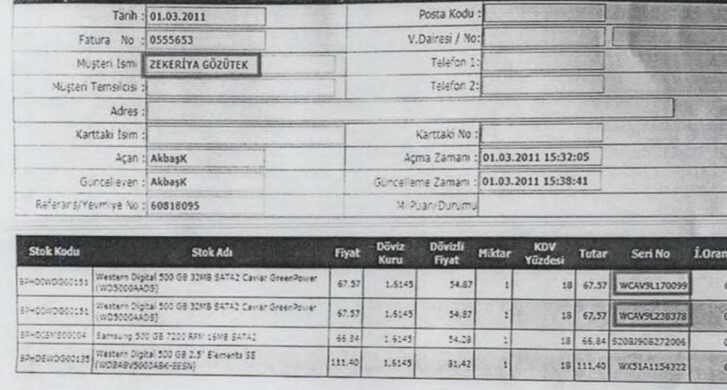Bilirkişi raporunda Delil 1 ve Delil 2 diskinin, 1 Mart 2011 tarihinde, Diyarbakır’da AVM içinde bulunan bilgisayar mağazasından, ismini Zekeriya G. olarak bildiren bir kişi tarafından nakit olarak satın alındığı belirtildi. Ancak internet, çeşitli kaynak ve veri tabanları üzerinde yapılan incelemede Zekeriya G. isminde bir kişiye rastlanmadığı ifade edilen raporda, mağazadan istenen satış faturasına göre Delil 1 ve Delil 2 adı verilen disklerle birlikte toplam 4 adet disk alındığı, 2 farklı hard diske ise arama ve el koyma tutanaklarında rastlanılmadığı bildirildi.