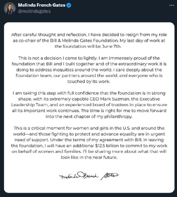 Eski eşi Bill Gates ise ayrı yaptığı açıklamada "Melinda'nın ayrılmasına üzülsem de gelecekteki hayırseverlik çalışmalarında büyük bir etkisi olacağına eminim" ifadelerini kullandı.