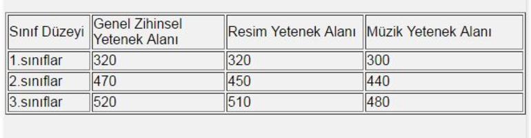 "2017-2018 eğitim öğretim yılında bilim ve sanat merkezlerimizde eğitimlerine devam edecek 1, 2 ve 3. sınıf öğrencilerine yönelik tablet bilgisayar uygulaması 11 Şubat 2017 -09 Nisan 2017 arasında gerçekleştirilmiştir. Uygulamada yetenek alanlarına ve sınıf düzeylerine göre bireysel incelemeye hak kazanan öğrenciler için taban puanlar Türkiye ortalaması üzerinden belirlenmiştir. Grup Tarama uygulamasında 1. Sınıflar için 60, 2 ve 3. Sınıflar için 70 soru sorulmuş olup her soru 10 puan olarak değerlendirilmiştir. Taban puanlar aşağıdaki tabloda belirtilmiştir."