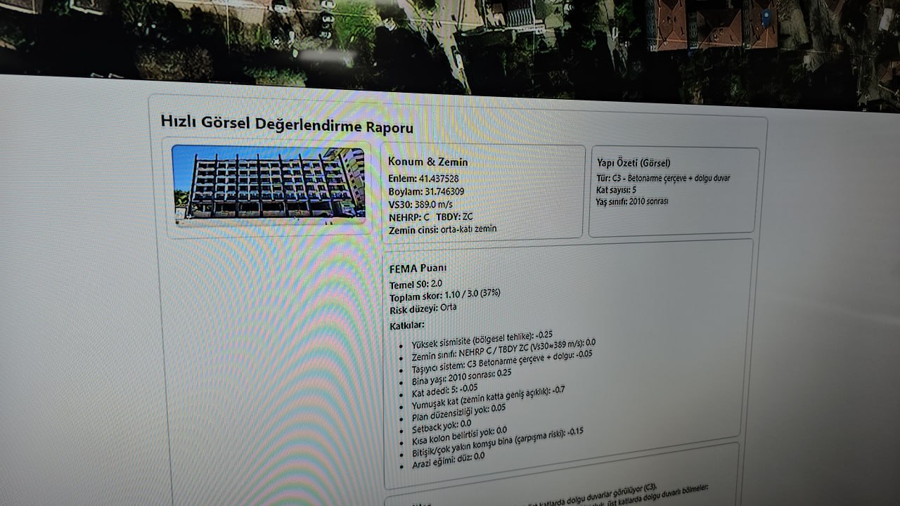 Prof. Dr. Kutoğlu, yazılımın Amerikan Federal Acil Durum Yönetim Kurumu (FEMA) tarafından geliştirilen “hızlı bina değerlendirme” formatını temel aldığını söyledi. Sistem, binanın fotoğrafları ve harita üzerinden konumu seçildikten sonra yaklaşık 5 dakikada bir değerlendirme raporu sunuyor.