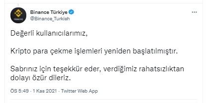 Binance, ilk duyurunun ardından çekim işlemlerinin yeniden başlatıldığını duyursa da, yalnızca 20 dakika sonra çekimlerin yeniden durdurulduğunu açıkladı. Yaşanan karışıklık için kullanıcılardan özür dileyen şirket, tüm gelişmelerin ilk duyurunun ardından tweet dizisi olarak paylaşılacağını belirtti.