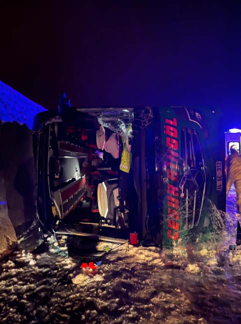 Rize’nin Çayeli ilçesinden Mersin’e giden plakası öğrenilemeyen Cesur Bingöl firmasına ait yolcu otobüsü, kar yağışı ve buzlanma nedeniyle devrildi.