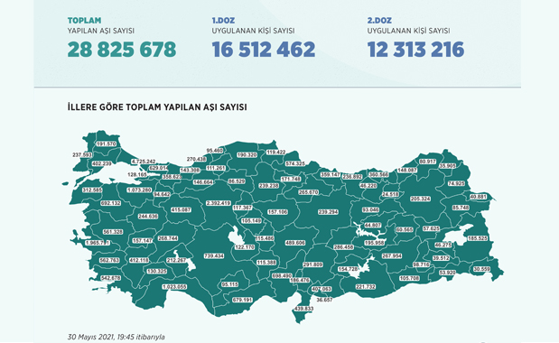 Sağlık Bakanlığı açıklamasına göre Kovid-19'la mücadele kapsamında uygulanan birinci ve ikinci doz toplam aşı miktarı bugün saat 19.45 itibarıyla 28 milyon 825 bin 678'e ulaştı.