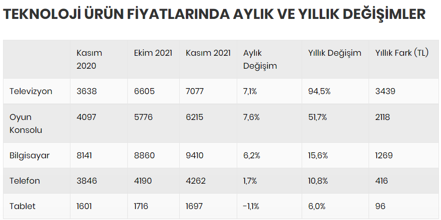 Türkiye’de geçen yılın kasım ayında ortalama 3 bin 638 TL olan televizyon fiyatı, bu yılın kasım ayında 7 bin 77 TL’ye; 4 bin 97 TL olan oyun konsolu fiyatları 6 bin 215 TL’ye ve 8 bin 141 TL olan bilgisayar fiyatı 9 bin 410 TL’ye kadar yükseldi.