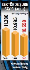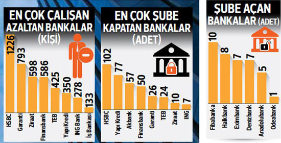 TBB raporuna göre eylül itibarıyla 49 banka faaliyette ve bunların 10 bin 658 şubesi bulunuyor. Bu rakam sadece 1 yıl önce 10 bin 985, iki yıl önce ise 11 bin 280 idi. Geçen yıl eylülden bu yıl eylül ayına en fazla şube kapatan banka daha önce Türkiye’den çıkacağını açıklayan ancak daha sonra bunu yeniden yapılandırmaya döndüren HSBC oldu. 102 şubesini bir yıl içinde kapatan HSBC Türkiye’de 89 şubeye geriledi.
