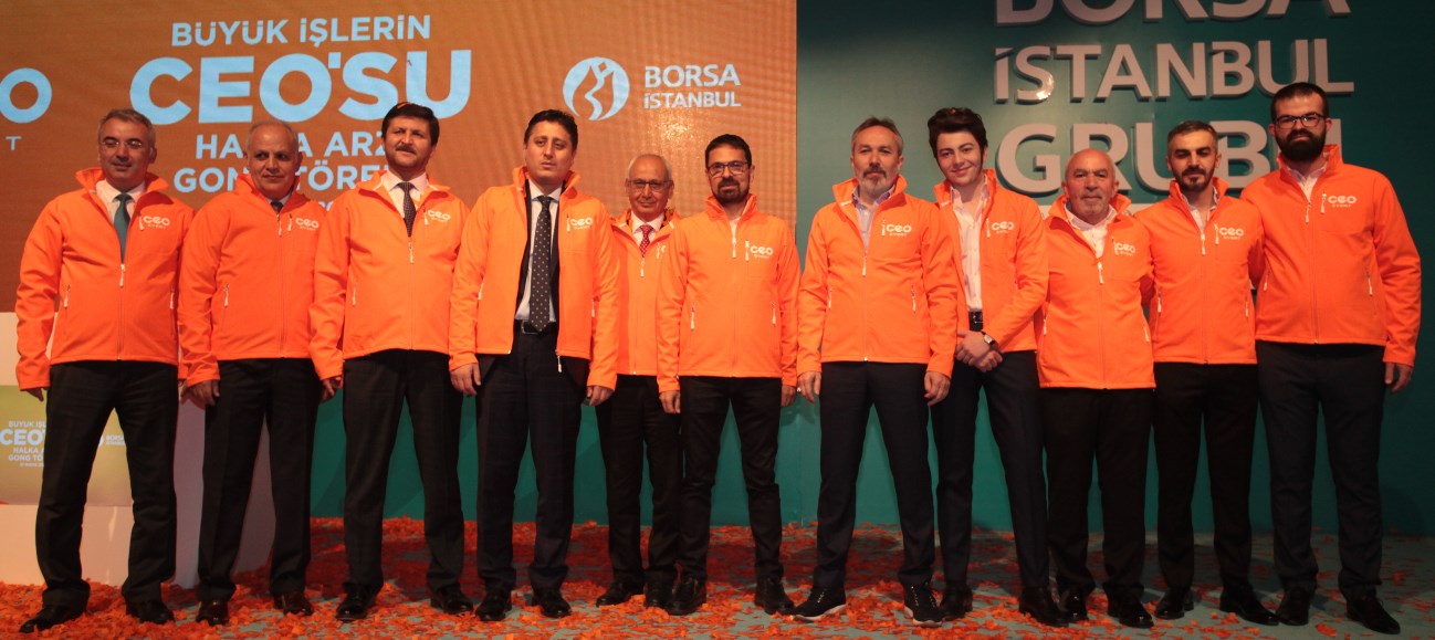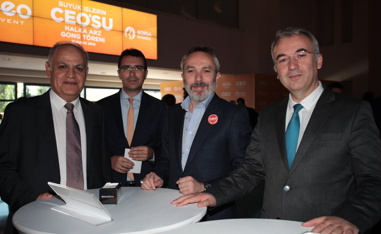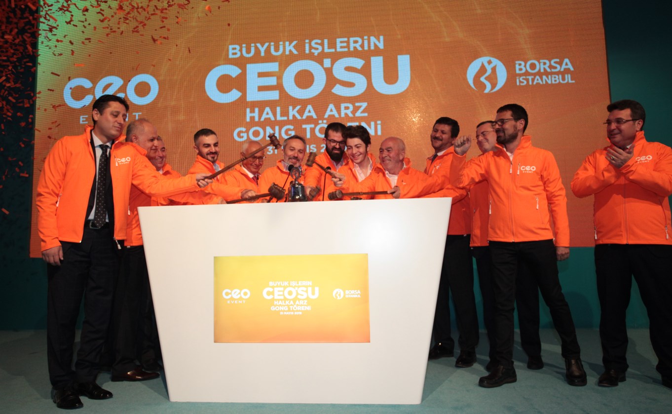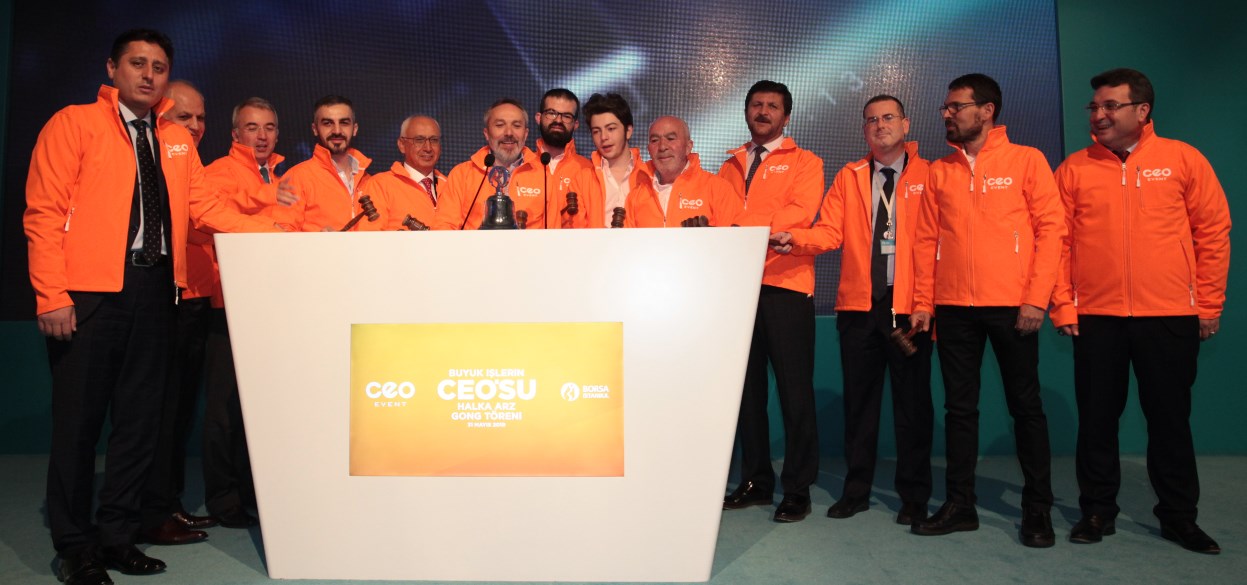 23-24 Mayıs’ta Borsadan satış yöntemiyle gerçekleştirilen, ancak planlananın aksine iki gün yerine daha ilk gün birkaç saat içinde hisselerin kapışılması ve 6 milyon 800 bin adet hisseye 18 milyon 33 bin adet talebin gelmesi üzerine borsaya ‘yoğun ilgi”yle adım atan CEO Event Medya için Borsa İstanbul’da ‘gong töreni’ düzenlendi. Borsa İstanbul Genel Müdür Yardımcıları Dr. Enes Korkmaz Ergun, Mehmet Gönen ve Ali Ömürbek’in eşlik ettiği törende, CEO Event Yönetim Kurulu Başkanı Cevat Olçok, Yönetim Kurulu Başkan Yardımcısı Fatih Olçok, Yılmaz Olçok, Şamil Olçok, Emir Olçok, CEO ve Yönetim Kurulu Üyesi Dr. Bülent Uygun ile Gedik Yatırım Yönetim Kurulu Başkanı Erhan Topaç, “Büyük işlerin CEO’su” için gongu birlikte çaldı. Törende CEO Event ailesi de yer aldı.