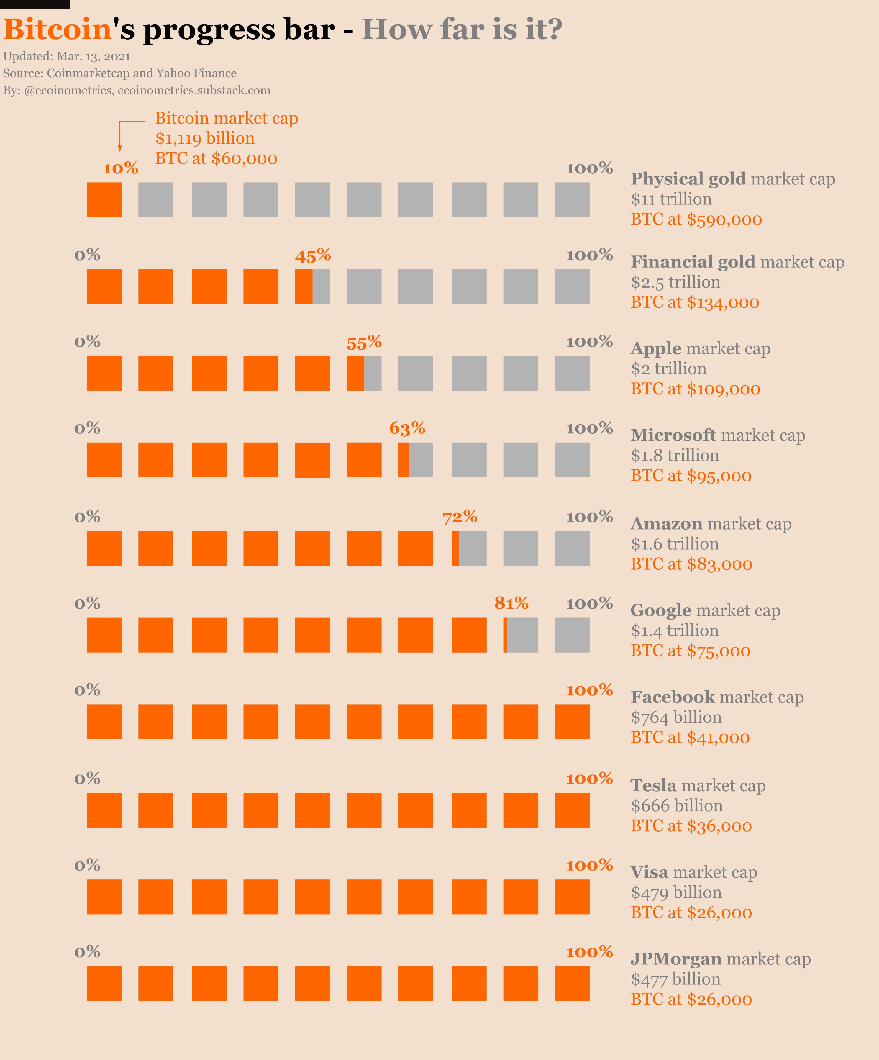 Piyasa değeri verilerini inceleyen zincir üstü analiz kaynağı Ecoinometrics, 13 Mart itibarıyla Bitcoin'in yatırım araçlarında tutulan altının yüzde 45'ine, toplam fiziksel altının ise yüzde 10'una denk geldiğini açıkladı.