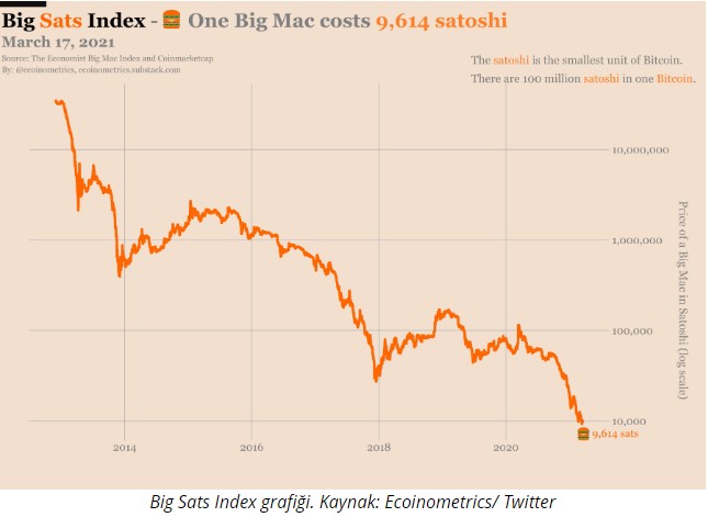 Ecoinometrics, 60.000 dolar civarında olan Bitcoin'in 10 bin 402 Big Mac satın alabildiğini, tek hamburger için 9.614 Satoshi'nin gerekli olduğunu söylüyor.