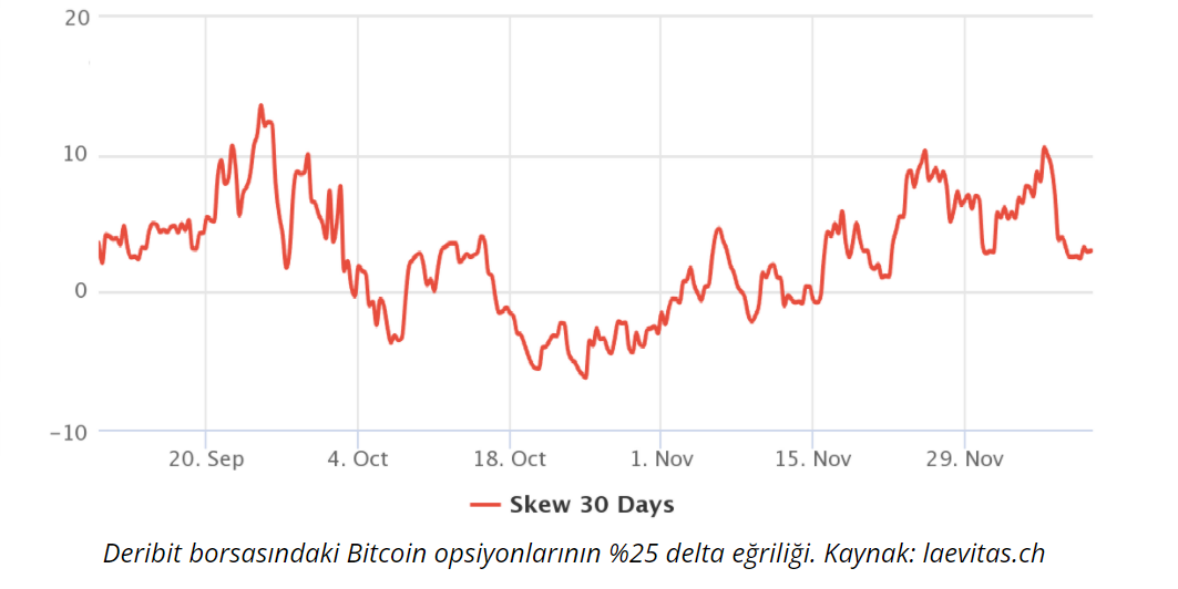4 Aralık Bitcoin çöküşünden önce %25 delta eğriliği, nötr olarak kabul edilen yüzde 6 civarındaydı. Önümüzdeki 3 gün boyunca gösterge yüzde 10 ile zirve yaptığı için opsiyon piyasası yapıcıları ve balinalar, orta derecede korku sergilediler, ancak şu anda yüzde 3'te duruyor.
