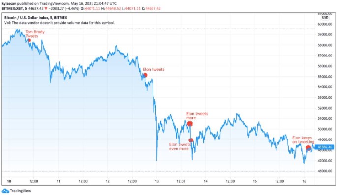 BTC/USD paritesi, Musk'ın geçtiğimiz hafta Tesla'nın BTC ödemelerini askıya alacağını duyurmasının ardından değer kaybetmiş. Fakat Musk için bu yeterli olmadı.